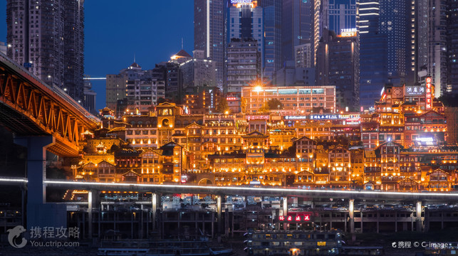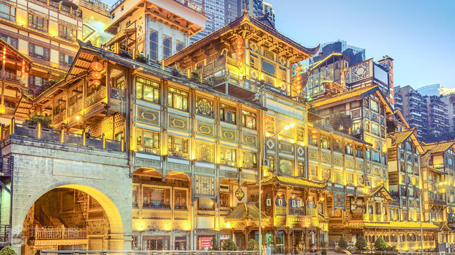 洪崖洞民俗风貌区是逛山城老街、观赏两江风光、品尝当地美食的好去处。洪崖洞民俗风貌区位于渝中区沧白路,长江、嘉陵江两江交汇的滨江地带,以具有巴渝传统建筑特色的“吊脚楼”为主体,依山就势,沿江而建。 夜景美爆了 洪崖洞民俗风貌区由纸盐河酒吧街、天成巷巴渝风情街、盛宴美食街及异域风情城市阳台四部分组成,以具有巴渝传统建筑特色的吊脚楼为主体,依山就势,通过分层筑台、吊脚、错叠、临崖等山地建筑手法,把这一片建筑汇聚在一起,夜晚时候灯火通明,堪称山城一景。 美食、购物、观景 走进洪崖洞民俗风貌区,两边都是密集的吊脚楼。从脚下的沿江路到顶层的沧白路有11层之多。各层内容不同,有餐馆、有小吃街、有酒吧咖啡厅,也有土特产商铺。顶层是异域风情城市阳台,可乘坐电梯直达。站在观景平台上,可远观两江交汇,风光无限。公告