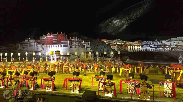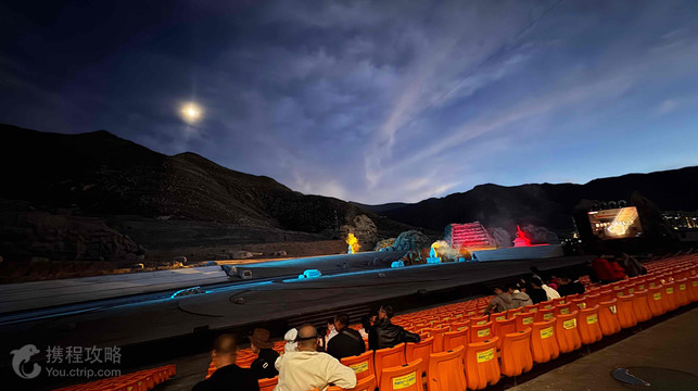 玩乐特色:【演出剧情:文成公主和亲松赞干布】序幕里刚健的卓舞,将观众带入1300多年前的爱情传奇。第一幕讲述文成公主起行出嫁。第二、三幕演绎漫漫长路上的乡愁与憧憬,注意金色马车中的释迦牟尼十二岁等身像,真迹在大昭寺仍能看到。第四幕欢歌跳舞迎接公主。汉藏和美的婚姻为第五幕划上句号。【宏大场面:星空为幕山川为景】演出场地在拉萨南郊的山上,是露天的,能直接看到星空。超大的舞台布景还原了大唐时的大昭寺、小昭寺、布达拉宫。机场传送步道被巧妙地利用,使出嫁队伍能不停行走过日夜和飘雪的冬季。你甚至能看到牛、羊、马奔驰在山上的景象,一切都让人感觉身临其境!【民族特色:汉藏非物质文化遗产大观】数十种汉藏非物质文化遗产元素被融入演出,序幕里的卓舞来自山南,第二幕有游客熟悉的戴着面具的藏戏,第四幕的打阿嘎动用了很多真正会跳该舞的藏区百姓,手执木夯边唱边跳。此外,果卓舞、僧人与法螺、热巴鼓、牛皮船的运用等等同样精彩绝伦!【座位区域攻略】票档分为380票、480票、580票、680票、880票和1280票,票价越高距舞台越远,反之距舞台越近,因为距离远,才能看见舞台的全景,视觉效果更好。拉萨的夜晚较冷,晚上看演出一定要穿上厚实的衣服。
