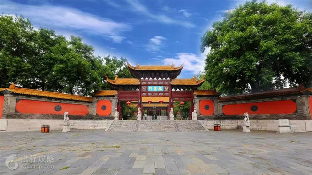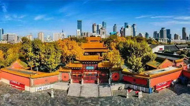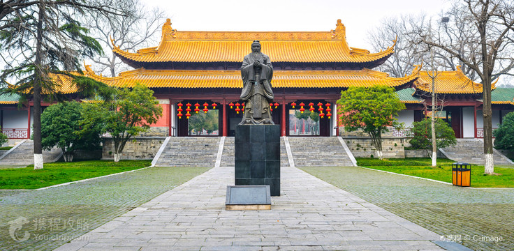 朝天宫是清代的文庙,整个建筑群包括了江宁府学、朝天宫、以及由朝天宫的几间大殿辟成的南京市博物馆。现在江宁府学为江苏省昆剧院,只能外观,游客能入内参观的只有朝天宫和南京市博物馆。 朝天宫的历史 朝天宫的历史可追溯至春秋,吴王夫差在这里的冶山冶铁铸剑,建文庙的历史可追溯至北宋,明代命名为朝天宫,是皇室礼拜道教诸神和学习朝见天子礼仪的场所,后毁于战火,清同治五年至九年(公元1866年-1870年)在原有基础上改建,又成为了文庙,江宁府学也从鸡鸣山迁于此处。 朝天宫 朝天宫南临人工运河“运渎”,有“万仞宫墙”围绕,墙内有一泮池,东西两侧分别为“德配天地”和“道贯古今”牌坊。主体建筑从东南到西北依次为棂星门、大成门、大成殿、崇圣殿,顶覆黄色琉璃瓦,棂星门下的四对团龙雕像栩栩如生,大成门前立着孔子塑像。崇圣殿后是后花园部分,东边的飞云阁附近是乾隆御碑亭,西边的敬一亭是冶山最高处。 南京市博物馆 崇圣殿的一侧是南京市博物馆的主展厅,主要有基本陈列《龙蟠虎踞--南京城市史展》。展品按照时代更迭的顺序排列,一层是远古到明清的展品,二层是民国时期的展品。三层是《玉堂佳器--馆藏精品展》,“镇馆之宝”元末明初的青花梅瓶即在这,瓶上惟妙惟肖地绘着“萧何月下追韩信”图。 南京市博物馆将大成殿和崇圣殿辟为特展和临时展展厅,朝天宫正在举办的展览都会写在门口的牌子上。公告