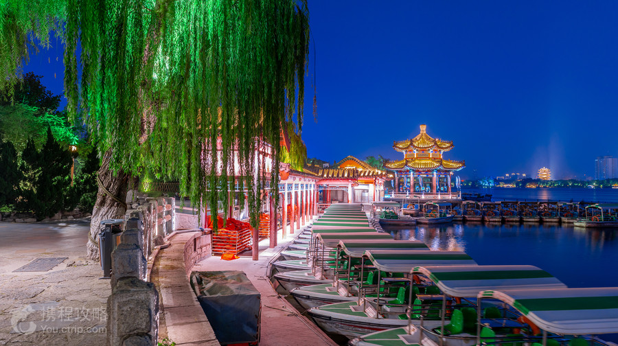 大明湖景区位于济南市中心偏东北处、旧城区北部,是集水域风光、园林景观、古建筑为一体的公园。大明湖就在公园中心,更可以说公园是依湖而建的。大明湖是一处天然湖泊,水源来源于城内诸多泉水,有“众泉汇流”之说,且它历史悠久,可以追溯到北魏时期。 大明湖景区分为老景区和新景区,整个景区共有16景,漫步其中,就像是在水墨画中游赏一般。此外,整个景区还与环城河相连,形成了环湖休闲游览景观线。园内水陆美景连绵不断,也是当年名人雅士的聚集之地,如今在此还能参观到老舍纪念馆,有着辛弃疾生平事迹展的稼轩园。 大明湖景区有东南西北四个大门,每个大门进去都有不同景致,其中,东门进入是老景区,这里主要可以看到的景色有“曾堤萦水”,曾堤是位于景区东面一条连接南北的长堤,也是湖南岸通往北渚亭的必经之路。堤上杨柳垂阴,堤两侧湖水波涛阵阵。曾堤旁一处超然楼,可以登高远眺整个湖的风光,这也是景区16景之一的“超然致远”。 沿着曾堤向南门方向步行进入新景区,这里有七座风格各异的桥,这里便是16景中的“七桥风月”。其中的鹊华桥是其中历史悠久,也是较为有名的一座桥。老舍纪念馆便坐落在该景点中。过了南门向西步行,便可至16景中的“稼轩悠韵”,它位于南门和西门之间,稼轩园原名稼轩祠,是为纪念爱国英雄辛弃疾而立。这里所到之处皆可感受到辛弃疾那爱国情怀、戎马生涯的画面与意境。 在此可坐景区内游船去湖中央的小岛,岛上有一座历下亭,亭子上方红底金字匾额是由乾隆皇帝手书的,亭中的墙上刻有蒲松龄为该亭作的《古历亭赋》全文。这里便是16景之一的“历下秋风”。 从这里继续坐游船前往景区北部,靠近东门处有一座“汇波楼”,登上汇波楼向南可眺望佛山,向北可眺望鹊华桥,而汇波楼下则是清澈的湖水。每当夕阳西下,湖面上波光粼粼,这便是16景之一的“汇波晚照”。 下了汇波楼向西步行,过了北门便可来到了16景之一的“沧浪荷韵”,此处有铁公祠、沧浪亭和小沧浪亭,每逢夏季,河面上荷花盛开,非常漂亮。 游览景区除了步行之外,游船也是不错的选择,泛舟湖上,既轻松又不误观光赏景。如果逛累了,北面和南门处还有餐厅供游人补充能量,价格会相对于园外贵一些。不愿在园中就餐的游客可自带食物,也可前往位于南门外的芙蓉街,这里是小吃一条街,价廉物美。