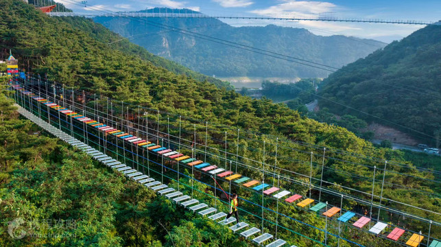 大连棠梨乐游谷坐落在有“大连绿肺”之称的国家4A级景区西郊国家森林公园内,棠梨乐游谷项目由合瑞文化旅游发展(大连)有限公司倾力打造,是大连户外极限项目的自然生态综合旅游休闲度假区,重点建成了天空玻璃桥、悬崖秋千、极速滑道、高空飞索、高空漫步、丛林穿越、高空自行车、极限荡绳、飞天威亚、彩虹滑道、9D影院等十余个游乐项目,同步建成了游客服务中心、停车场、铁锅炖、林中茶语营地等配套服务设施;二期项目拟定位为美食商业街、原生态民宿、会务康养、文创、树屋、主题咖啡店、禅修馆等,随着项目的建成,棠梨乐游谷将成为大连湖光山色中游客必到的网红打卡地、极限项目体验中心和休闲度假乐园。 大连棠梨乐游谷自2020年5月试运营已深得广大游客的喜爱,是都市人群释放压力、家庭友人聚会狂欢、学校社会实践、青少年价值观培养、研学教育和企事业单位团建的不错选择!★远离尘嚣,亲近自然的人间仙境。★释放压力,登高一览众山小。★极限娱乐,走在时尚前端的游玩。★和风丽日,组成一幅梦境般美丽的旅行画面。 项目简介 【天空玻璃桥】 大连市内大气雄伟的9D天空玻璃桥,全长300米,高138米,蓝天白云、绿树碧水尽收眼底,是拍照打卡的好去处; 【悬崖秋千】 位于海拔165米的悬崖峭壁处尖叫声响彻山谷的悬崖秋千,是乐游谷非常惊险刺激的项目,秋千上升到人体与地面平行的高度时瞬间放下,顿时肾上腺素飙升,犹如在天空翱翔,眼前是壮阔美丽的莽莽群山; 【高空飞索】 利用重力下滑、穿越云海的高空滑索,全程300米,滑翔者在整个过程中能同时享受滑索的惊险和山水的俊美; 【步步惊心】 惊险刺激的步步惊心,全长280米,高60米,彩色木板桥和玻璃吊桥平行而立,是锻炼勇气的好选择,从一步相识、两步相知到十步共白头,走过吊桥幸福一生; 【极速滑道】 大连市内很长的“大滑梯”——极速滑道,全长280米,落差90米,乘坐长长的滑道穿越林海,飞驰而下,欢笑声不绝于耳。 【空中自行车】 妙趣横生的空中自行车夹在步步惊心吊桥中间,承重在钢丝绳上,280米的往返完全可以体验一把“速度与激情”,也可以选择缓慢前行,甜蜜摇晃的自行车,周围好似飘着粉红气泡; 【丛林穿越】 呼唤童心的丛林穿越项目,全长200米,让孩子与家长间充分协调,增进感情,锻炼孩子的智慧与坚韧,开启亲子间的奇妙之旅; 【彩虹滑道】 彩虹滑道会带给你刺激和快感。随着身体在快速下滑的同时,你仿佛置身手绚丽多姿的彩虹之中,不仅适合孩子们畅快玩耍,也给大人们带来无尽的乐趣。让每个人都享受到纷飞的快感和欢笑声。 【极限荡绳】 跑男同款。全程约250米,钢丝绳高约35米,距离地面150米。原名新西兰秋千,是集高空秋千+蹦极的结合体,惊险刺激,是年轻人的 “尖叫收割机”。 【飞天威亚】 全程约300米,距离地面高度约150米。可以一人飞也可以双人齐飞,该项目设有多种服装道具,包括古装、动漫等服饰。游客可以像影视剧演员一样,穿上自己喜欢的服饰,或仗剑乘风,一跃碧空!或轻功飞跃,来一次水上飞舞!
