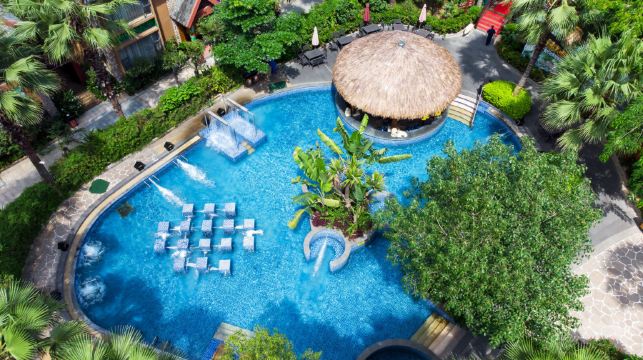 温泉区每天晚上8:30-21:00都有固定的表濱:享受巴厘岛风情温泉区,温泉池共建设爪哇海啸动感温泉冲浪、温泉漂流区以及众多的药物浸泡、花浴等各式温泉池45个,让游客感觉就像在沙滩上冲浪般刺激,还可以让游客和设施进行互动——温泉喷水、发出声音等。温泉池旁边的假山上有个舞台,游客在冲浪、漂流、泡温泉之余还可欣赏到别具东南亚风情的歌舞表演。