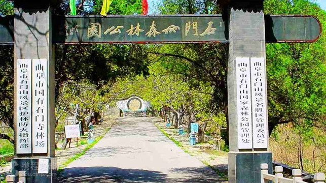 石门山因两山对峙如石门得名,这里山峰峻秀,林木葱茏,风光秀丽。山上名胜古迹众多,传说孔子曾在此撰写《易经·系辞》,李白、杜甫结伴游齐鲁时于此宴别,孔尚任出仕前后两次隐居,现有孔子系易处、李杜宴别处、秋水亭、孔尚任隐居处等遗迹。山上有石门寺,是曲阜仅有的一座寺院。现有千佛殿、藏经阁等建筑,塑有三世佛、十八罗汉等神像。石门山,有冰雪涧、藤花幄等二十四景,尤以“石门月霁”著称。石门山附近,距市区15公里处有石门书院,为曲阜旧时四大书院之一。公告