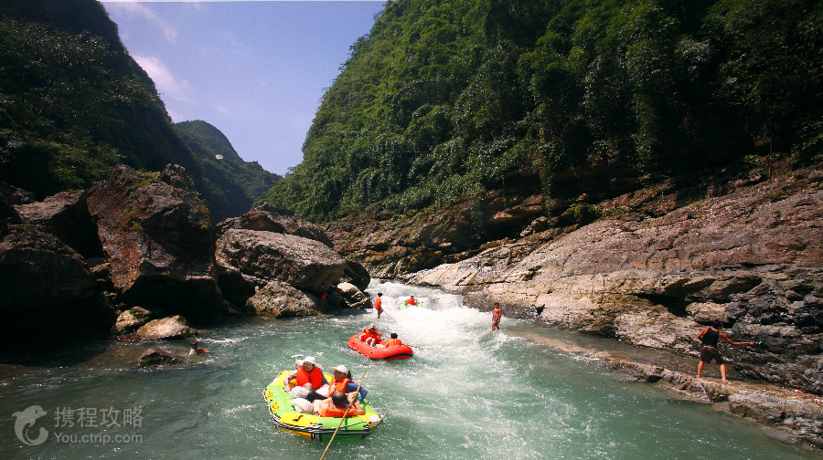阿依河景区峡深谷高、河床狭窄,河水清幽而景色,是夏季避暑嬉水的好去处。阿依河漂流分为上、下两个半程(分别收费)。其中上半程水面平静,没有激流;下半程河道比较湍急,途中有激流险滩三处,其中第一处为惊险。从阿依河景区入口到竹板桥码头,可以乘坐百米电梯(天梯),天梯是修建在母子溪峡谷的观光电梯,整个电梯运行高度约148米,是目前亚洲高的峡谷类景区室外观光电梯。或者你可以沿着向下的台阶(号称千步梯),步行大约半个多小时到达码头。牛角寨是划分阿依河上、下段的分界线,在这里可以乘坐电瓶车直接到达景区的出口处。公告