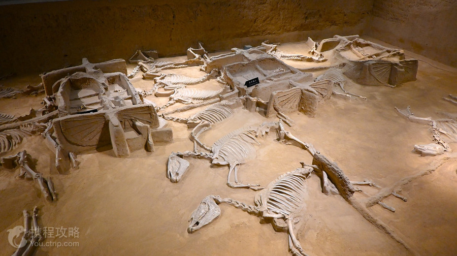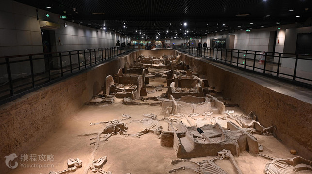 天子驾六博物馆,位于洛阳市中心,是当年修建东周王城广场时发现的东周时期大型的墓葬和车马坑,其中在五号车马坑中,出土了一辆六匹马拉的车,这就是知名的“天子驾六”。按照中国古代的礼制,只有“天子”才能乘坐六匹马拉的车(诸侯五匹马,百姓只能乘坐一匹马拉的车)。 天子驾六博物馆规模虽然小,但是我国惟一一处以原址展示的博物馆。博物馆分为两个展区,当游客进入馆内后,先游览第一展区,在这里你能够看到东周时期洛阳城作为周天子王城的历史介绍,这里还有一些东周时期的青铜器可以观赏。 游览完第一展区,向西穿过一段不长的走道,就进入了第二展区:东周时期大型车马坑展区,这里是博物馆的重点参观区域。 考古工作者在这里发现了多座东周墓葬和车马坑,可以判定这里埋葬了一支两千多年前完整的周天子出行的车队遗迹,出土了多辆马车遗迹和马匹遗骨。令人震撼的是五号车马坑内的一辆“驾六“车马遗迹。当你来到坑前,映入眼前的是当年周天子所乘坐的马车,车厢呈方形,车厢、车轴、车轮、车辕痕迹清晰。在车厢之前、车辕的两侧放置着六具完整的马的骨架。车马坑内还有许多狗的骨骼,可能是当初被人活埋时四散逃命,有的狗骨至今还俯卧在马车上。看到遍布坑内的马骨和狗骨,你可以想象这些动物们殉葬时的激烈场景。 为了保护文物,在这里探明的一些墓葬并没有挖掘,有一些挖掘出来的墓葬和车马坑后来又被回填了。