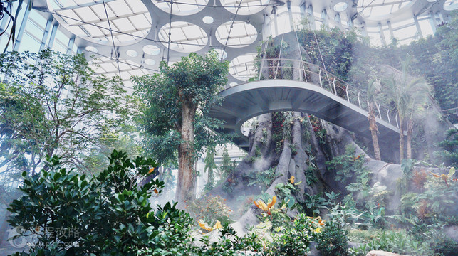 上海温室花园位于上海世博文化公园中心位置,紧邻中心湖,背靠双子山,占地约2.2万平方米,地上地下总建筑面积约4万平方米,是集观赏游览、休闲娱乐为一体的多功能综合体。外形设计通过对原上钢三厂老厂房的改造利用,把历史记忆和现代元素结合在一起,形成自然优雅的云状曲线。上海温室花园有4个场馆,由空中连廊、工业桁架相互连接成一个整体,其中4个场馆是游服中心1个,主题场馆3个。3个主题场馆分别是海市沙洲(1号馆)、云上森林(2号馆)、云雾峡谷(3号馆)。3大主题场馆空间以变异的叶、会呼吸的根和空中的花为故事线,分别展示热带干旱植物、热带雨林植物与热带花卉植物。同时,展示形式上力求表现植物到博物+文化的延展,从而打造好看、好玩的沉浸式展览温室。上海温室花园夜游项目已正式上线,邀您解锁夜游新体验,探索植物王国的夜间奥秘。