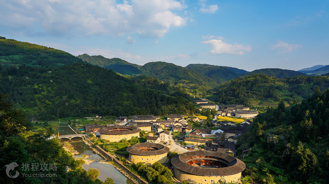 狮子山观景台是河坑土楼群的观赏处。站在狮子地冻山顶可以从三个方位看到不同造型的三个土楼群共有27座。在右前方的一片开阔地与山坡连接处,座落着7座土楼,分别是河坑土楼群-东升楼、河坑土楼群-晓春楼、永庆楼、春贵楼、绳庆楼、南动楼和永荣楼,这就是“北斗七星”。河坑土楼群坐落在狮子山前,两条溪流在左边山脚下交汇,形成了河坑村的地理结晶“丁”字水。走在河坑村高大林立却带有泥土烟火气息的土楼群中,有归隐田园的恬静。河坑土楼群都以河卵石堆砌为基础,加以泥土磊成墙体,约三四层高,刀削般峭立。这些土楼都是封闭式的,底层只有一个大门,门楼皆是石板材,半圆拱顶,大门栓都是6寸见方一丈来长的硬木直插墙内,没有2人无法伸缩开启楼门。二、三楼外墙台有开窗均匀分布,错落有致。河坑土楼群中间是个天井,周围平均分割成若干格子,每格4米宽,3米多深,这是房间,大的土楼,如河坑土楼群-东升楼、春贵楼、裕昌楼每层有36个房间,可以住100多人,圆楼的房间呈现斧头现状,站在天井张望,酷似一只高大的木桶,颇有坐井观天之感。公告