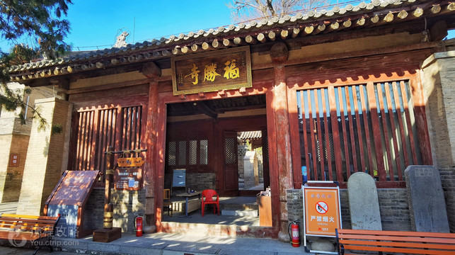 福胜寺,位于山西省运城市新绛县城西北17千米光村,创于唐贞观年间(627~649年)。明弘治十一年(1498年),大修福胜寺。福胜寺坐北朝南,前后两进院落、占地面积5598平方米,沿中轴线,依次为山门、天王殿、弥陀殿、三佛洞、藏经阁。弥驼殿及藏经阁下部密洞为元代遗构。其余皆为明、清时期所建。山门为木制牌楼式建筑形制。7层斗拱托起巍峨檐角。钟鼓楼分列东西,主体建筑单檐歇山顶建筑风格,四周为拱券式门洞,有木制牌楼、东西厢房等建筑形成一个天井式的小院落。公告