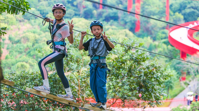 虹桥公园丛林穿越是深圳光明区树上探险乐园。项目坐落在碧湖区K2点观光塔旁,占地约两千平方米,依托原生荔枝林搭建三层高空网阵:底层亲子线(1.1米即可体验)、中层少年挑战线、高层勇士线,共36个节点,包含吊桥、独木桩、网道、滑板穿越、泰山跳等关卡,既能锻炼平衡与勇气,又可俯瞰虹桥“红飘带”蜿蜒全景。完成高空线路后,可乘坐高差26米、近百米长的“森林光影滑道”瞬间滑回地面,全程钢缆保护,专业教练随行,一票可循环上下,单日不限次数畅玩。园区配套完善,观光塔、碧湖小火车、彩虹步道、餐车集市环绕,适合亲子、团建、研学,是城市中心半小时车程即可抵达的“树上冒险乐园”。