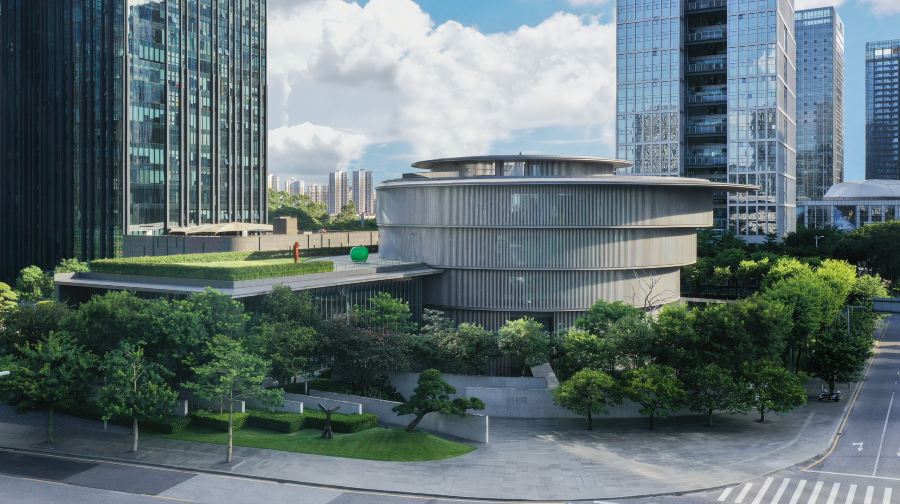 和美术馆(HEM)位于广东顺德,是由家族设立、安藤忠雄设计的非营利民营美术馆。和美术馆由建筑师安藤忠雄担任设计,总面积约为16,000平方米,其中展厅面积约8,000平方米。通过运用清水混凝土作为建筑材料,安藤先生将光、水、风等自然元素融入到这座具有岭南建筑文化意境的美术馆中。【关于和美术馆】HEM的建筑设计把对立的特征融合起来,形成了由简单的圆形和方形构成的建筑形体。作为中心的圆形,其重心和尺度伴随着高度发生偏移,产生了由内到外,由建筑到城市,缓缓扩散的效果。这是中原古建筑“天圆地方”的传承,也是象征性纯几何学立体的交错而创造出具有岭南建筑文化特征、呈现光影礼赞的建筑风景。· 双螺旋清水混凝土楼梯建筑从细部到整体构成,甚至包括景观设计,都如同水面的波纹一样,层层展开。而中心便是圆筒状5层挑空的空间。双重螺旋楼梯盘旋而下,形成中央圆形空间。如同DNA结构的双螺旋清水混凝土楼梯,是HEM建筑一个令人叹为观止的亮点,同时也见证了中国建筑技术的飞跃进步。夹岸花园夹岸花园的动线,暗含了曲径通幽的意境。弧形的清水混凝土隔墙在园中有序地分布、环绕,配合多种精心选植的粉色系开花乔木,使观众恍如夹岸数百步,忽逢桃花林般畅游于诗意之中。在这个户外空间里,景观设计以水景为主,与“圆”相呼应的水池,可作为缓和亚热带夏季酷暑的亲水装置。同时,当建筑倒映于水面,它便是建筑别具特色的底座。