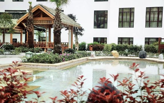 天台温泉山庄地处天台山脚、国清寺旁的温泉山庄,自然走的也是清雅大气之风,建了一个目前全国大的汉唐风格建筑群。整体建筑接近于中国传统的四合院布局,青砖白墙,由汉唐风格的四周楼群加一个开阔的中心庭院组成,整个建筑群显得古朴大方高雅。除了常规的21个户外泡池,山庄抢眼莫过于中心庭院清澈的室外恒温温泉泳池。在暖暖的泳池里扑腾扑腾,抬头便见神秀天台山倒影水中也是一种畅快、适意。