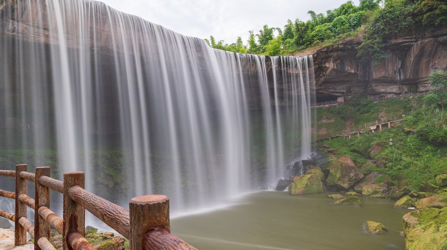 低坑大瀑布景区地处四川省广安市岳池县,系嘉陵江江岸基岩塌陷形成的。它宽约200米,高约70米,比黄果树景区宽,但高度较之要低。尽管如此,其气势,其壮美之程度,一点也不输与其他名瀑。来到瀑布旁,无不被浩荡壮丽之风貌所折服。景区以自然风光为主题,按照“一个中心、六大功能区“(即游客综合服务中心、瀑布观光区、花卉观赏区、休闲娱乐区、园田观光休闲度假区、湿地保育区、丛林娱乐区)的空间布局,打造集瀑布和花卉观光,融合生态休闲、运动养生、度假娱乐等多元素于一体的乡村休闲旅游目的地。