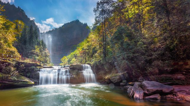四面山景区位于重庆西南部,距重庆主城、四川泸州、贵州遵义均100余公里,处于渝川黔旅游金三角核心地带,是距离重庆主城很近的国家5A级旅游景区和度假区,仅1.5小时即可抵达,距江津城区60余公里,属云贵高原大娄山北翼余脉,系地质学上的倒置山。景区于1988年被确定为“重庆市级自然保护区”, 2014年被评为“重庆首批市级旅游度假区”“影响世界的中国文化旅游名景”,2015年被评为“国家5A级旅游景区”“国家生态旅游示范区”“中国森林氧吧”。2017年被评为“国家体育产业示范单位”,2019年被评为“中国(重庆)气候旅游目的地”,2020年被评为“中国气候康养地”。 景区幅员面积213.37平方公里,主要有望乡台、土地岩、龙潭湖、洪海、珍珠湖、水口寺、会龙庄、爱情天梯等核心景区,128个景点,自然景观独特、生态环境优美、旅游资源丰富,极具游憩价值,是休闲度假的旅游目的地。因其好山好水、富硒富氧而备受关注,被国际生态学会专家誉为全球植被丰、水质佳、空气纯的地区之一。“奇山”“异水”“红石”“厚文”四大景观资源特色明显:——奇山:四面山海拔高度为560-1709.4米,夏季气温在22—25℃。年均温度13.7℃,森林覆盖率高达96%,负氧离子每立方厘米含量高达29000多个,是地球北纬28°仅有的面积大、保护完好的亚热带原始常绿阔叶林带,有中华双扇蕨、桫椤、红豆杉、林麝、猕猴、中华鱼类、中华秋沙鸭、弹琴蛙等珍稀动植物近3700种,被国际生态学会专家誉为“天然物种基因库”。——异水:四面山有飞龙河、茶坝河、临仙河三大水系,海拔800米以上的湖泊有9个,形成规模宏大的高山湖泊群,水域面积达5平方公里。拥有以“华夏第一高瀑”望乡台瀑布为代表的举世罕见的高山瀑布群,其中垂直落差在100米以上瀑布有3挂,80米以上瀑布有11挂,50米以上瀑布有37挂,有“千瀑之乡”的美誉。——红石:独特的地理位置和自然条件,成因类型多样,有107个地质遗迹景点。同时拥有完整的“丹霞赤壁——瓮形围谷——高山瀑布”组合而成的罕见地质遗迹。以土地神岩为代表的丹霞地貌,发育于距今9600-6500万年间的晚白垩世夹关组地层中,极具世界自然遗产价值。土地岩壁画长376米,高127米,面积近5万平方米,有“亚洲神岩”之称。——厚文:四面山留下了距今5000多年的先巴人文化遗迹——灰千岩摩崖壁画,道教文化遗址、朝源观、文家寨,西南第一庄园——会龙庄、中国西少林——四面山少林寺等人文景观,以爱情天梯为代表的爱情文化都具有重要的历史与文化价值。四面山不仅有四面山景区,周边还有神秘的会龙庄景区、爱情文化的中山古镇爱情天梯、宗教文化围绕的四面山少林寺、舒适怡人的四面山旅游度假区(四屏镇)。