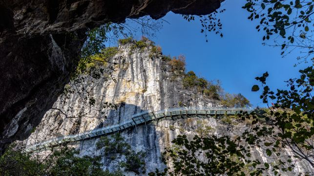 石门仙湖景区是柳州市融安县一处非常原生态的自然美景,这里景观多样,有几百米高的天然迎宾石门、立于悬崖峭壁之上的玻璃栈道、形态各异的溶洞以及一水穿三门的暗河,每一处都让人不禁感叹大自然的神奇。 这里山林耸立,绿树环绕,步入景区大门不久后便可看到一道高几百米的拱门,而两侧均是平整的山壁,这就是景区中有名的“迎宾石门”。至此可沿着玻璃栈道步行于悬崖之上,然后通过景区内的游览栈道走过上洞、中洞、下洞,途中可欣赏到那条一水穿三洞的天然暗河。下洞便是溶洞美景所在之处,形态各异的钟乳石在五彩斑斓的灯光照耀下,显得绚丽多彩。欣赏完钟乳石美景后,乘坐洞口的游船便可畅游在这暗河之上,穿梭在两岸崇峰峻岭之间,欣赏景区的湖光水色。