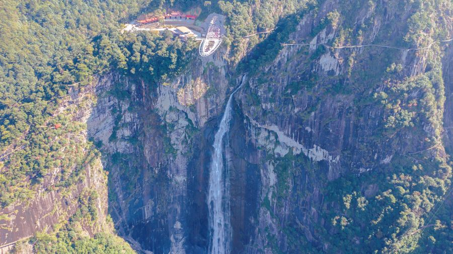岱仙瀑布,位于福建省泉州市德化县水口镇榜上村水尾的赤石口。溪水从山峰的缺口直下139米,站在瀑布下可以看到飞流直下,水雾形成的虹霓霞雾,使你感到山岚袭人。岱仙瀑布发源于石牛山的赤石溪,经过山势雄伟的飞仙山峰,落差139 米,分两股飞泻而下,东为岱仙瀑布,西为油漏瀑布。两处交相辉映,格外壮观。岱仙瀑布为福建省较大的瀑布之一,名列“泉州十八景”。