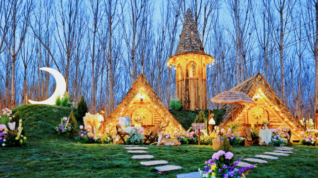 嚒嚒兽梦幻森林”占地总面积为500亩,核心区150亩,除了一块小型运动草坪,景区几乎被树林所覆盖,是名副其实的森林营地。这里有“森林市集”“户外音乐派对”“营地奇妙夜”“亲子话剧”“天空下的艺术创想”“运动集合能量场”等多元场景,集特色市集、户外体育、休闲娱乐于一体。