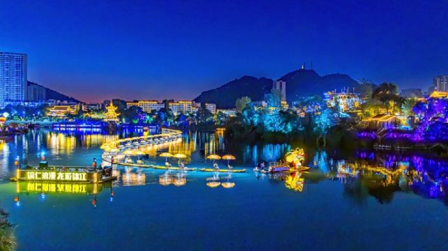 “铜仁浪漫,龙游锦江”项目就坐落充满魅力的中南门古城附近。铜仁龙游锦江由贵州元璞旅游有限公司倾情打造,以中南门古城、锦江河为轴心,围绕“景城一体,主客共享”的理念,集水上竹筏游船、民俗歌舞表演、沉浸式剧情演绎为一体,打造了一个丰富的综合类夜游体验,是一场融合历史文化与现代休闲体验的特色之旅。