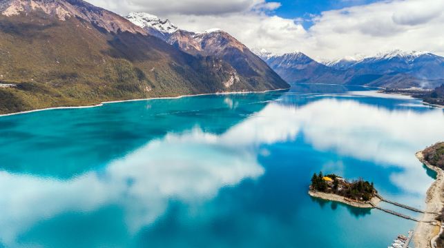 巴松措位于林芝工布江达县,是藏传佛教红教的著名神湖,宗教地位很高。湖水碧绿柔美,周围青山依依,风景非常不错。湖心岛上的措宗贡巴寺历史悠久,有特别的雕塑和建筑,也是祈福的圣地。 这里旅游开发比较成熟,是西藏比较老牌的景区。进入景区后,需要乘坐观光车游玩,路上一般会停留三个点,分别是湖心岛旁、观景台和结巴村。另外,景区内还有游艇可以游湖,大约需要另外付费100元。 景区可以通过建设在湖面上的步行栈道登岛,岛上的措宗贡巴寺建于唐代末年,岛上的礁石均雕刻成了别致的动物形象以及佛像,特别神奇。观景台离湖心岛不远,这里角度稍高,可以俯瞰湖水和小岛,景区经典机位就是出自这里。结巴村是湖边一处安静的村落,由于很多旅游团都不会在此停留,反而成就了这里的宁静悠然,村庄颇有些瑞士小镇的风貌,十分不错。
