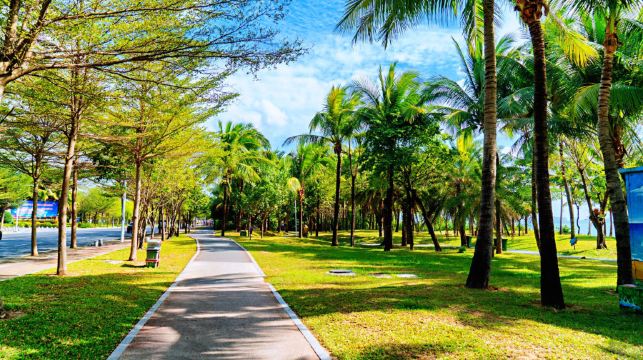 椰梦长廊是环三亚湾修建的一条海滨风景大道。置身于碧海蓝天椰子树的环境中,漫步在景观大道或海边,可以很好地感受海南的美丽与悠闲。这里的晚霞和夜景也很有名,夜晚可以在海边吃烧烤喝啤酒,看街头表演。椰梦长廊全长20公里,依湾绵延,椰树成林向西延伸至天涯湾。临海的一侧是景观优美迷人的热带植物园林,另一侧是休闲度假区,度假区里面从家庭旅馆到高品质的酒店都有。经常可以看到有人来这里拍摄婚纱照,充满了浪漫的气息。无论什么时候来,你都能感受这份悠闲。晴朗的日子,金黄色的落日晚霞将会布满整个三亚湾椰梦长廊上空。对面的凤凰岛晚上会开起激光彩灯,优美的歌声也会慢慢飘来,靠近海边会有烧烤啤酒,也有好多街头演出可以观看。悠闲地坐着,望着海边的美景,慢慢享受晚上的美好时光,真是再惬意不过了。
