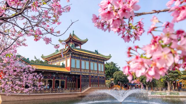 2023年宝墨园汉风古韵樱花节浪漫来袭,湖光山色、灿烂樱花、园林古建、汉服佳人,满园樱花和古典建筑相映成辉,畅享小桥流水赏樱花的园林意趣!在宝墨园,一隅古建搭配满园樱花,随手一拍就是中国风赏樱大片,这是宝墨园樱花节无可比拟的独特优势。 宝墨园门前就有两幅工艺精湛的民间砖雕,分别为包拯怒铡陈世美与包勉的故事。园内还有大量的灰雕、石雕、陶塑和紫檀木雕,以及传统宫灯。 特别的是瓷塑浮雕《清明上河图》和巨幅砖雕《吐艳和鸣壁》。 一进门的大影壁,就是《吐艳和鸣壁》,取百花吐艳,百鸟和鸣之意。图上的图案有极富岭南特色的芭蕉、振翅飞翔的凤凰、各种动物,形态栩栩如生,画面布局和谐,整幅画立体感非常强。而大型彩绘浮雕瓷壁画《清明上河图》,则是宝墨园的镇园之宝,已经列入吉尼斯大世界纪录。 除外,宝墨园还是一座博物馆,较亮眼的是赵泰来艺术宫和宝墨园-赵泰来藏品馆。艺术宫内,有赵先生捐的1600件藏品,包括木雕、青铜器、古玉等。藏品馆中,则是各种字画。 作为一个公园,园内种植的植物也很多,还栽植有大量的岭南盆景。除了树木花卉和建筑之外,园内还有龟池、宝墨园-放生池、锦鲤池、莲池等,锦鲤池内有非常多的锦鲤,而莲池夏天会开满荷花。风味食街则可以品尝到番禺特产小吃姜撞奶、鱼皮饺等,别有一番风味。 “荷花胜境”位于宝墨园东面,与逍遥岛景区紧密相连。荷花池面积1000多平方米,每年种植两造荷花,夏荷过后,别具特色的秋荷又登场。池中央矗立着一尊金光灿灿的观音坐像,一条几百米长、顶上种满各种花卉的回廊环绕荷花胜境凌空飞架。