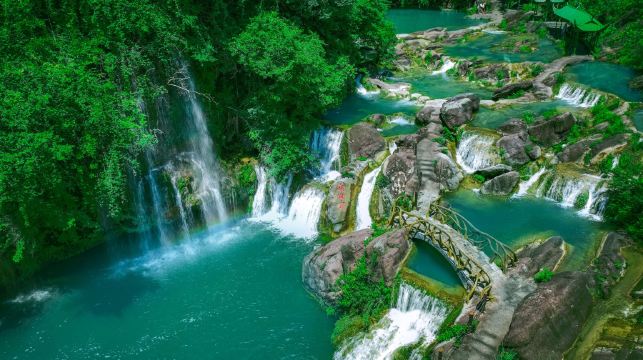 醉美瀑布群,大汉皇后园 汉世祖刘秀之妻阴丽华、宁平公主刘伯姬以及当年绿林军众多将领家眷居住于此。 美人谷景区的水呈现出一种近乎凝固的蓝色,被誉为媲美“九寨沟”的瑶池仙境。 美人谷景区由数十个气势磅礴、形态各异的瀑布组成,是我国难得一见的瀑布群奇观。 限定惊喜 汉服游园会——沉浸式探寻古韵清辉 酒店配套—-绿林好汉大酒店 星级度假酒店 378间多种房型 足疗按摩 - 卸去旅途疲劳 儿童乐园 烧烤营地 绿林山生态美食 周边游玩推荐 1. 鸳鸯溪漂流-距离美人谷景区驾车约3分钟 2. 绿林寨景区-距离美人谷景区驾车约13分钟 3. 天河通天峡景区-距离美人谷景区驾车约12分钟 4.空山洞景区-距离美人谷景区驾车约40分钟