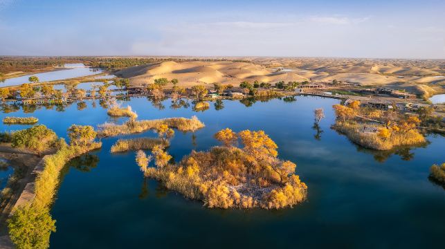 罗布人村寨位于尉犁县西南侧,距离县城车程约35公里,原是罗布人大的村庄之一,如今在原有的基础上修建了很多罗布人特色的建筑,做成一个巨大的、反映罗布人文化的人文旅游区。在这里可以参观罗布人的房屋、祭台等众多建筑,同时还有沙漠、塔里木河、胡杨林风光,可以观景娱乐,是尉犁县重要的景点。罗布人是新疆古老的民族之一,人们都以在塔里木河畔打渔为生。这个民族与其他民族千百年来一直隔绝,有独特的文化和民俗,非常神秘,如今真正的罗布人已经不多,景区便是一个很好地了解神秘罗布人文化的地方。景区的面积很大,刚一进入景区便可以看到周围的沙丘、戈壁风光,游客需要在此乘坐区间车进入村寨。区间车车程不远,一路可以看到很多高大的胡杨树,风光苍凉壮阔。进入村寨后,可以看到罗布人的房屋、婚房、祭台等等极具特色的建筑,了解罗布人的特别民俗,还有当地的罗布人歌舞表演等可以观看。除了了解文化外,景区内的塔里木河、神女湖等都风光优美。在景区的深处是一片沙漠,游客还可以在此体验骑骆驼、沙漠滑翔伞等众多的娱乐项目,沙漠的湖中也可以泛舟划船,趣味十足。