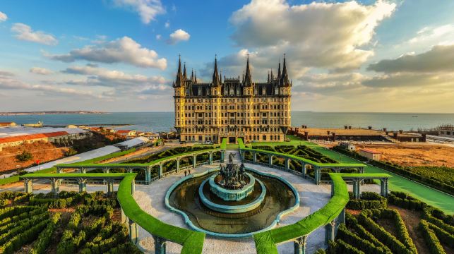 文成城堡位于烟蓬旅游观光大道旁,由欧洲建筑元素巧妙组合而成,以巴洛克风格为主,以珍贵洞石为主建筑材料,体现了名门气息。周围有护城河环绕,内装海水,可养海参、鲍鱼,也可供人戏水划船,乐趣十足。尽管只有4层高,但造型上典雅大方,圆形屋顶直指蓝天,两侧梯形与锥形屋顶相互穿插,叠加交错,壁炉烟囱点缀其间,充分表现出了欧洲技术所独有的浪漫主义情怀和英雄主义气概。 城堡一层、二层可提供餐饮,三层为客房,四层可用作会议场所。其中室内二楼20米高的椭圆形大厅气势恢宏,让人感觉仿佛进入了神圣的殿堂。在此可举行婚礼庆典、交响乐演出、国际高峰论坛会议等。大殿小厅及每个房间处处光彩夺目,内壁装饰以雕刻、巨幅油画及挂毯为主,配有17、18世纪造型超绝、工艺精湛的家具,厚重的木质楼梯栏杆及晶莹美丽的水晶灯,处处彰显着城堡的品质与品位。 城堡中占地面积达5000多平方米的地下酒窖更是精彩绝伦,酒窖由黑色和棕红色火山灰石堆砌而成,展示着如教堂、城堡、古镇及来自巴黎、伦敦、圣彼得堡等各地的欧洲经典建筑,陈列着油画、雕塑,同时还将介绍欧洲宫廷礼仪,教人欣赏交响乐、芭蕾舞和歌剧等高雅艺术,在浓厚的艺术氛围中培养名门生活习惯,提高修养、熏陶气质。地下酒窖里还藏有世界各地葡萄酒2000多个品种,介绍推广葡萄酒文化的起源与发展。
