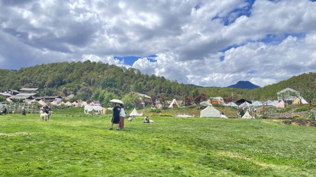 马匹走上崎岖的山路,便是走上了当年的茶马古道,上下起伏地颠簸中不难想象马帮的艰辛。到达望海坡时,俯看拉市海全景,犹如高原上的明镜。拉市海的湖水不深,水草与湖面齐高,星星点点的波光在水草间露出的湖面眨眼。观海景餐厅提供的火塘土鸡火锅是丽江当地美食,砂锅放在炭火上,锅里肉美汤鲜,锅外围一圈土豆,也烤得热乎乎香喷喷的。