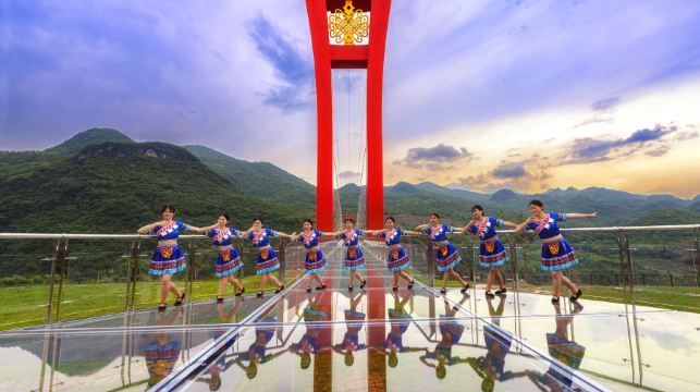 擎天玻璃桥,位于广东省连州地区境内的湟川三峡——龙潭度假区(国家AAAA级旅游景区)内,具有跨度大、桥面宽、重量轻和梁高低等特点,是一座全透明玻璃的景观桥梁,兼具景区行人通行、游览、蹦极、溜索、T台等多项综合功能。 这条建造在秦汉古道水路上玻璃桥,横跨湟川三峡陡崖峭壁,尽览粤北大瀑布群,凭借别出心裁的结构和超凡脱俗的外观,已成为连州市高速创造“历史文化之旅、自然景观之旅、国际通道之旅”的标志性建筑。擎天玻璃桥在万丈悬崖与流泉飞瀑间凌空而建,悬浮于湟川三峡的绝壁和深潭之上,与周边环境相互融合,气势磅礴而又和谐统一。远观宛如一条昂首云天、腾云驾雾的巨龙,飞越大峡谷的陡崖峭壁,若隐若现穿行在湟川三峡的烟雨云雾之中。桥身的颜色选用了千年流传的中国红,这不仅是中华民族喜爱的颜色,还是中国人的文化图腾和精神皈依,中国红的色调使整座桥在湟川三峡谷中常见的云雾缭绕里显得更加惊艳醒目。 擎天玻璃桥全长为526.14米,是一座大型山谷单跨悬索桥,现场施工采用全预制进口螺栓连接,既保证了项目的安全性,结构的稳定性,又提升了观赏的刺激感。整座玻璃桥通体采用3层4.5厘米厚度的进口超白夹胶玻璃,这种超白玻璃的透光率为99.15%,其水晶般的光泽、高清晰的亮度、超高的光折射率,无不让游客的视野更加明亮、观景更加通透、观感更加刺激。桥梁两侧采用竖向圆弧形不锈钢护栏,让游客在玻璃桥上360°览景拍摄的同时保障安全。 设计师赋予了擎天玻璃桥许多关于爱情的元素,从踏上这座玻璃桥起便开始了一场浪漫的旅程,点睛之笔就是桥面渐变成4个互相对称的“心心相印”超宽观景平台,可同时容纳1000人,仿佛等待着情侣们的山盟海誓和赤子们的追梦之心,每个“心”型平台宽13米,长14米,寓意着“一生一世”。 漫步空中玻璃天桥,俯视脚下数十道飞瀑悬空落河、喷然若雾,两岸峡深壁陡、直如刀削,悬崖耸峙在阳光的辉映下如七彩霓虹,美伦美奂。置身超俗的诗画走廊,却步履凌空心惊胆战,这种“眼睛在天堂,身体在地狱”的奇幻之旅,适合与恋人携手并进,考验彼此间爱的勇气。下山时,临水曲折的古栈道沿途设有多个拍摄位置,是情侣和家庭游玩打卡必到之处,终点是被誉为“浪漫终点站”的桃花岛。 这条横亘在湟川三峡上的“红色巨龙”,氤氲着古色古香的秦汉气息,延续着盛世气派的唐宋遗风,沿袭着灿烂辉煌的魏晋脉络,流转着独领风骚的元明清神韵,以其丰富的文化内涵,在两端桥塔上盘成错综复杂的中国结,高度概括着龙的传人生生不息的历史,同时也代表着“吉祥如意”和“团圆兴旺”。