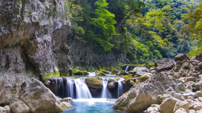 卧龙谷,位于荔波县小七孔景区内,是鸳鸯湖与卧龙潭之间的一段明流,因水质好且能吸收折射较多蓝光绿光,故多呈蓝绿色,清如明镜,群山树映,鸟鸣花香,山水相辉,景致一格。 卧龙谷漂流,从卧龙潭出发沿溪而下直至鸳鸯湖上湖,漂流全程约1.5小时。荡舟前行,溪流忽时而狭窄,时而宽阔,一道道绿荫幽深的水上长廊,一汪汪清澈见底的深塘,更有河中小岛如盆盆花木盆景屹立在水的中央。