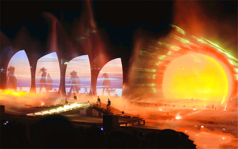 “日出东方”海之秀是一个大型多媒体水上演出秀,选址在奥林匹克水上公园目标塔南侧,可容纳观众2032人。“日出东方”海之秀演出舞台整体设计为风帆结构,两侧为帆型天幕,中间为巨幅水幕,以木质浮桥为舞台前景,与水云基地景色巧妙融合,与视频虚拟与现场实景相结合,运用全彩激光、音频影像、4D动画、喷泉、水雾、烟花、火焰等高科技与传统文化内容有机结合的大型跨媒体实景演出。