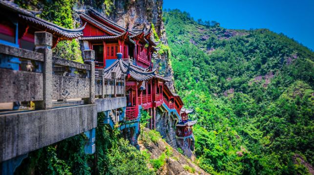 大慈岩风景区位于建德市南面24公里处,山上有金闪闪的双面佛像,半山腰的寺院建筑一半嵌入岩腹,一边凌架悬空,和恒山悬空寺有异曲同工之妙,因此也被称为“江南悬空寺”。 景区中处处体现一个“悬”字,栈道、寺庙、大佛都依着陡峭的崖壁建立,尽管大部分是重建的,仍让人不由惊叹古人的创造力。 游览路线 景区内的游览路线大致是个环形,游玩大慈岩风景区,推荐坐索道上山,而后逆时针步行下山,省时省力。上山后还有上上下下的山路要走,有些地方没有遮挡,夏天会比较晒。整个游览的乐趣是顺着曲曲折折的栈道行走在崖壁边,欣赏嵌在山里的步道、寺庙、佛像,以及远处山下绵延的青山和山下渺小的城镇,景象十分壮观。 悬空栈道 在山下远远就能看到山顶金闪闪的双面佛像,下了索道,走一小段山路便是悬空栈道。栈道上是拍摄大慈岩风景区主要建筑全景的不错机位,不要错过。走过栈道,也别忘了回头拍一张栈道的近照,贴在山腰的飞檐廊亭也算的上大慈岩风景区的标志景观。继续往前走一会儿,天然立佛是这里的又一特色:从侧面看,整个大慈岩风景区主峰像极了一尊地藏王菩萨的立像。奇石、怪洞、草木和谐地组合成大佛的五官,游人到此都无例外地要驻足观赏一番。 寺院内景 双面佛和大慈岩风景区-地藏王大殿是一大亮点,游人可以顺着栈道一路走到双面佛像跟前一睹真容,也可以去到大慈岩风景区-地藏王大殿祈福。天门背后的的樱花树下,枝桠上挂满了人们祈福的红丝带,透着佛门的清幽气质。罗汉堂中的造像也颇有张力。 在大慈岩风景区-地藏王大殿参观完后出庙门,右手边有步道下山(约30分钟)。步道比较隐蔽,找不到可以问问工作人员。下山路的风景也不错,有溪流相伴。10月份银杏黄时,景致更有韵味。若要索道下山,则需原路返回索道上站。 另外,2014年《爸爸去哪儿》的取景地新叶古村离大慈岩风景区不远,可一并游玩。看老房子、逛古村落、体验“明星同款”的游乐项目,感觉很不错。