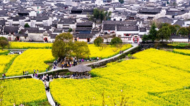 西递位于黟县东南8公里,黄山市西北50公里处,是典型的徽派古村。宏村看水,这里则主要看建筑,记得留意建筑上的徽派三雕,砖雕、石雕、木雕,花纹枝桠精细得仿佛一捏就断。而来此写生的美院学生又是另一道风景。 村中的居民多姓胡,相传为唐太宗李世民的后裔,为躲避战乱而改姓胡。村子始建于北宋皇佑年间,发展于明朝景泰中叶,鼎盛于清朝初期,当时腰缠万贯的徽商将自己的故里建设得舒适气派,现在我们看到的明清建筑依然保持着昔日的堂皇。 古村仿船形而建,横跨于三条溪水之上,南边的前边溪和后边溪在村内的汇源桥处汇合成西溪,西溪与北边的社屋溪又在村口汇合,溪流都由东往西流,因此得名。村中道路四通八达,入口有多个,主入口在西南角,一般由西南向东北游览古村。 到了主入口,首先看到的是胡文光牌楼,建于明万历六年(公元1578年),气势恢弘,代表着胡氏家族的显赫地位。牌坊通体采用当地的“黟县青”大理石雕筑而成,顶上有五层,每一层都有不同的精美石雕。牌楼边是明经湖,可以拍摄徽派建筑的倒影。 进入村子,来到位于横路街口的瑞玉庭,这是一座具有代表性的徽商住宅,建于清咸丰年间。里面有意思的是一幅幅对联,比如全是走字底的字组成的对联“迎送远近通达道,进退迟速游逍遥”,再如“快乐每从辛苦得,便宜多自吃亏来”,讲述经商道理的同时,也蕴藏着处事哲学。 向东走,过前边溪,东岸的敬爱堂始建于明万历年间,清乾隆年间重建,是村中现存面积较大的祠堂。敬爱堂以前是胡氏家族议事、举办婚事、教斥不肖子孙的场所。屋内悬挂的大大的“孝”字让人印象深刻,“孝”上的“土”字右半边像作揖的人,左半边像猴,意思是守孝道方为人,反之就如猢狲一般。 沿前边溪接着向东北走,上游的尚德堂距今有400年历史,是村中现存古老的明代屋子。从入口一路走来,你还可以参观住宅与书馆相配的建筑西递古村景区-桃李园;徽派庭院西园、东园;清代西递首富胡贯三晚年的居所惇仁堂。另外,走马楼、西递古村景区-绣楼和追慕堂等,也是这里极有特色的明清建筑。 3、4月份来景区可以看到白墙黑瓦与油菜花相互衬托的美景,不过要避开清明节,游客实在太多。 这里的商业化程度比较高,不少当地人家开出了农家乐,也有挑着担子在街边卖小吃的,你可以品尝到徽州特色美食,有腊八豆腐、烧饼、竹笋、电视节目《舌尖上的中国》里介绍过的毛豆腐、臭鳜鱼等。 如果想要享受古村的宁静,可以住上几晚,在清晨与黄昏时逛逛古村,避开白天的人群。村中住宿多是古建筑改造的家庭式客栈,在景区门口凭身份证登记后,于入住期间可以无限次出入古村。 古村距离宏村景区18公里,距离黄山风景区43公里,一般游客会把这里、宏村、黄山放在一起游玩。