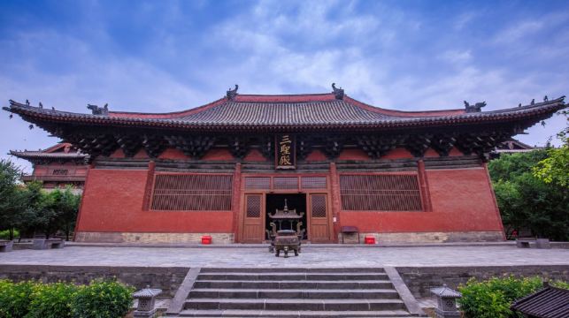 善化寺,位于大同市区西南方,始建于唐代,后毁于战火,辽、金时期开始重建。如今的善化寺是我国现存较为完整的辽金寺院。寺中的主要建筑善化寺-三圣殿、大雄宝殿等,都位于南北方向的中轴线上。和很多寺院不一样,善化寺是没有山门(大门)的。 寺内的大雄宝殿,是善化寺规模较大的殿宇,建于辽代,金代重修。来到殿内,正面供奉有“五方佛像”,从西到东的排列是:北方不空成就佛、西方阿弥陀佛、中部毗卢遮那佛、南方宝生佛和东方阿閦佛。五方佛是佛教“密宗”崇奉的一组尊神。殿内两侧的砖台上还站立着二十四诸天塑像,这些塑像都是金代塑像中的精品。这些人神合一的杰作,每尊都高约三米,有的披甲执仗,有的朝冠官袍,有的圆润、衣带飘荡,尊尊表情生动传神。在大殿墙上,还有清朝康熙年间所绘的壁画,壁画的内容都是佛经故事。 此外,寺中善化寺-三圣殿内的供奉着的“华严三圣”塑像,释迦牟尼佛和普贤、文殊两位菩萨,也是形象生动、栩栩如生。在寺门前的广场,你还能见到上世纪八十年代迁过来的五龙壁,五龙壁是明万历年间遗物,壁中五条巨龙翻腾于波涛汹涌的云雾之中,其中一条“正龙”,怀抱一颗火珠,头朝正前方,正对着古寺。