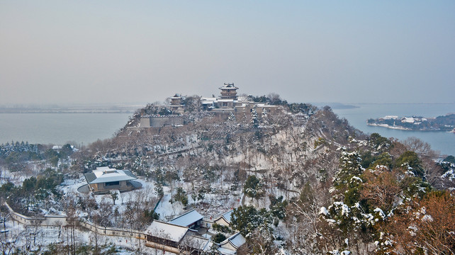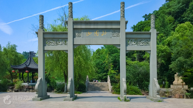 北固山是长江边的“京口三山”之一,位于另两座山金山和焦山中间,海拔55.2米。山上的景点多与《三国演义》中的故事有关,以北固山公园-甘露寺出名,是故事里刘备招亲结识孙尚香的地方。古往今来,游客到此都为寻访三国英雄的足迹,辛弃疾游此曾留下“天下英雄谁敌手?曹刘,生子当如孙仲谋”的名句。它由前峰、中峰、后峰(主峰)组成;前峰在南边,与中峰被马路隔开,上面是镇江烈士陵园;中峰在中间;后峰在北边,直插入长江中。游客游览的主要是中峰、后峰,两峰相连,因为此山不大,所以并无一般巍峨大山需要上上下下的辛苦。山上多有岔道,可沿“8”字形的主要道路游览。上山可走“8”字下面圆圈的左半边,进大门后左边是凤凰池,右边的试剑石据说是刘备与孙权劈石许愿所留,然后沿东吴古道拾级而上,到“8”字两圆交汇处附近的铁塔。铁塔底下两层是宋代古迹,上两层是明代古迹,虽然残破但仔细看基座和塔身上都有漂亮的花纹。山顶上的环线构成“8”字上面的圆圈,看到刻有“天下第一江山”的墙壁后,走对面写有“南徐净域”题额的拱门(南徐是镇江别名),拱门西边所连接着的石砌建筑便是北固山公园-甘露寺,康熙、乾隆曾在此建行宫,现在寺西还留有御碑亭。寺内有大殿、老君殿、观音殿和江声阁等建筑,按照《三国演义》第五十四回“吴国太佛寺看新郎,刘皇叔洞房续佳偶”,殿堂里放置着表现故事情节的三国人物塑像。北固山公园-甘露寺后的多景楼又名北固山公园-北固楼,为现代新建,是看风景好的地方,登楼所见脚下长江波澜壮阔,往西能见金山,往东能见焦山。多景楼西有狠石,据说是孙权与刘备(一说诸葛亮)共商赤壁大计之处,还有孙、刘赛马的溜马涧;东有祭江亭,据说是孙尚香听闻刘备过世后投江自尽的地方。回到铁塔处,可以走“8”字下面圆圈的右半边下山,一路看看中山纪念林,东吴孙权的名臣鲁肃墓,名将太史慈墓,最后回到大门口。若时间充裕,推荐北固山北边的江边风景带,不要钱,沿着铺于长江上的木头栈道走走,吹吹江风特别舒服。还可以看看东边山脚的东吴文化长廊,长廊的墙上挂着一幅幅展现东吴历史的书画。