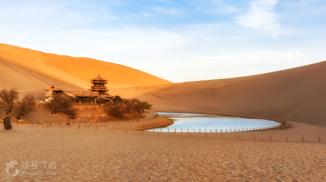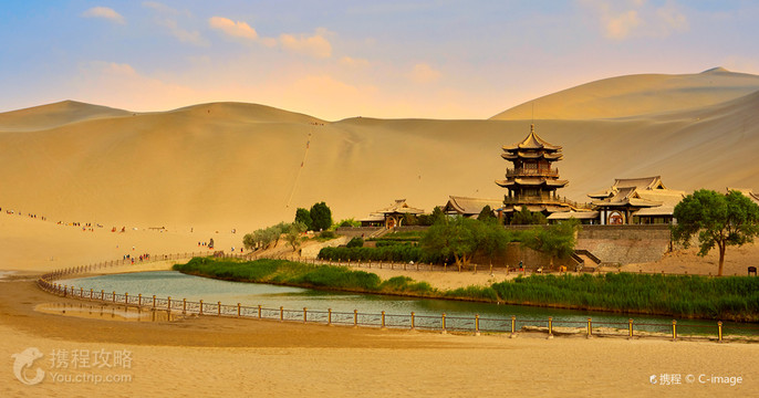鸣沙山月牙泉位于敦煌市区以南,这里沙山与泉水共处,历来以“沙漠奇观”闻名于世,是敦煌的名片之一。在这里你既可以爬上鸣沙山,俯瞰月牙泉,还能在山顶上欣赏大漠日落,感受西北大漠的苍凉广阔。 虽然历来水火不能相容,但是月牙泉却安然处在这一片沙山之中。月牙泉位于鸣沙山下,处在沙丘环抱之中,因为地势的关系,刮风时沙子不往山下走,而是往山上流动,所以月牙泉永远不被沙子埋没,被誉为“沙漠之眼”。 鸣沙山的山体由流沙堆积而成,远远望去,沙丘高低起伏,蔚为壮观。游览景区建议安排在下午,这样既可以避开中午沙漠中的酷热,还能在夕阳西下时,爬到山顶遥望远处的沙海和山下的月牙泉,观看唯美的日落。 景区目前提供多种游乐项目,如:骑骆驼、滑沙、滑草、沙漠摩托车、射箭、直升飞机游览等,其中骑骆驼和滑沙较受游客欢迎,值得体验。 游客进入景区后,游客可以直接爬上鸣沙山,欣赏完景色后,选择滑沙下山。当你从山顶下滑时,会听到“咚咚咚”的响声,似敲锣打鼓,让人胆战心惊又颇感刺激,鸣沙山因此得名。