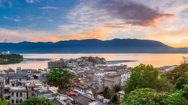 洱海位于大理古城东侧,青葱的苍山脚下,湖泊蔚蓝,以山水美景和独具风情的各个村镇而闻名于世,是大理四大名景之一。 这里有名的景色是东岸的双廊,这里可以欣赏到优美的湖景,阳光透过云层,折射在湖水上,形成了“洱海神光”,以连绵的青山为背景,是摄影爱好者捕抓的风景大片。