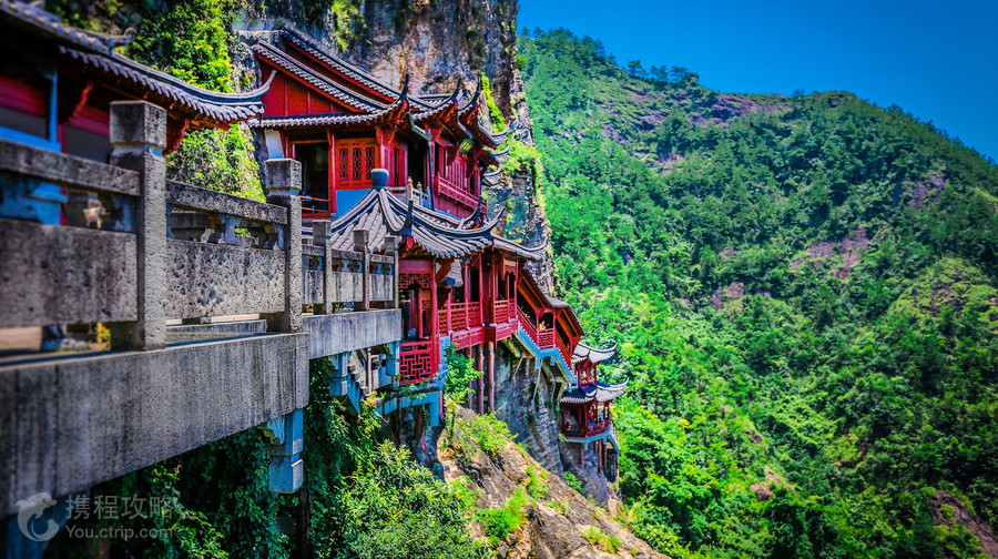大慈岩风景区位于建德市南面24公里处,山上有金闪闪的双面佛像,半山腰的寺院建筑一半嵌入岩腹,一边凌架悬空,和恒山悬空寺有异曲同工之妙,因此也被称为“江南悬空寺”。 景区中处处体现一个“悬”字,栈道、寺庙、大佛都依着陡峭的崖壁建立,尽管大部分是重建的,仍让人不由惊叹古人的创造力。 游览路线 景区内的游览路线大致是个环形,游玩大慈岩风景区,推荐坐索道上山,而后逆时针步行下山,省时省力。上山后还有上上下下的山路要走,有些地方没有遮挡,夏天会比较晒。整个游览的乐趣是顺着曲曲折折的栈道行走在崖壁边,欣赏嵌在山里的步道、寺庙、佛像,以及远处山下绵延的青山和山下渺小的城镇,景象十分壮观。 悬空栈道 在山下远远就能看到山顶金闪闪的双面佛像,下了索道,走一小段山路便是悬空栈道。栈道上是拍摄大慈岩风景区主要建筑全景的不错机位,不要错过。走过栈道,也别忘了回头拍一张栈道的近照,贴在山腰的飞檐廊亭也算的上大慈岩风景区的标志景观。继续往前走一会儿,天然立佛是这里的又一特色:从侧面看,整个大慈岩风景区主峰像极了一尊地藏王菩萨的立像。奇石、怪洞、草木和谐地组合成大佛的五官,游人到此都无例外地要驻足观赏一番。 寺院内景 大慈岩风景区-双面佛和大慈岩风景区-地藏王大殿是一大亮点,游人可以顺着栈道一路走到双面佛像跟前一睹真容,也可以去到大慈岩风景区-地藏王大殿祈福。天门背后的的樱花树下,枝桠上挂满了人们祈福的红丝带,透着佛门的清幽气质。罗汉堂中的造像也颇有张力。 在大慈岩风景区-地藏王大殿参观完后出庙门,右手边有步道下山(约30分钟)。步道比较隐蔽,找不到可以问问工作人员。下山路的风景也不错,有溪流相伴。10月份银杏黄时,景致更有韵味。若要索道下山,则需原路返回索道上站。 另外,2014年《爸爸去哪儿》的取景地新叶古村离大慈岩风景区不远,可一并游玩。看老房子、逛古村落、体验“明星同款”的游乐项目,感觉很不错。