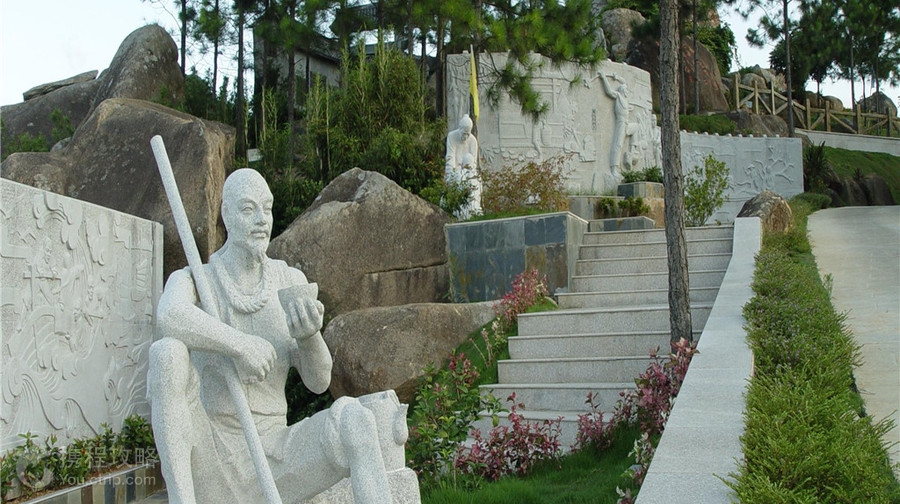 天福“唐山过台湾”石雕园(天福服务区)是天福集团投资的第一个高速公路服务区,由服务区、石雕园、观光茶园、皮定均将军纪念园四大部分组成。天福石雕园以“唐山过台湾”为主题,以天福集团创办人李瑞河先生的家史为蓝本,利用山上丰富的自然石资源,以石雕语言为载体,采用圆雕、浮雕、刻线雕、仿真雕等多种手法,讲述多数祖辈艰苦奋斗,创造辉煌,然后再回来投资兴业,回馈桑梓的故事,体现海峡两岸同根同源、同文同种、一脉相承的史实。天福石雕园主题共分为四个区和一座闽台民俗馆,以“唐山过台湾,筚路辟新天。百年传薪火,数代系茶缘。花甲再创业,芳草报故园。豪情惊陆圣,茗谱大同篇。