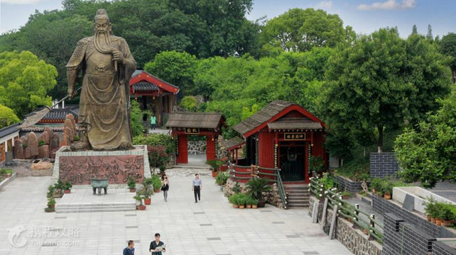 荆州的关羽祠,位于古城南门附近的卸甲山上,是荆州百姓为了纪念关羽而修建的,希望能借关公的忠、义、仁、勇精神,以教育后人。原祠始建于明初,后毁于日寇的战火,现存建筑是2007年复建的,是荆州古城中的一处重要景点。 整个关羽祠具有明清的建筑风格,南面紧靠荆州古城的砖城墙,东、西、北三面台基与土城垣融为一体。关羽祠的入口和出口紧挨在一起,当你进入景区大门后,可以沿着景区内的参观小路逆时针绕圈步行游览即可。 游客经过飞檐翘角的山门后,再登上33级石砌“天梯”,就可以来到关羽祠的正殿。33级石梯源于“三月三日开天门”的当地民间传说,寓意登上这33级天梯,人生自此一步一个新台阶。在关羽祠的正殿内,有关羽和其子关平、关兴的塑像,塑像中关公头戴汉巾,身着汉袍,左手捋须,右手作“免礼”状。在后殿正面的巨幅匾额上,你还可以看到用隶书镌刻的陈寿《三国志·关羽传》全文,有兴趣的话可以读读。 在正殿二楼,还有一尊关公的姿铜像,在铜像前的有“关公圣迹沙盘”,是用沙盘展示关公一生行踪的示意图,游客可以根据示意图了解到关公一生征战的足迹。在景区,还可以浏览祥和殿、诚信殿、卸甲山石碑、关公立姿石像、念佛堂等建筑。