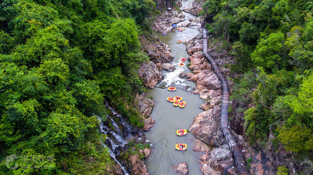 红峡谷漂流位于五指山红峡谷文化旅游风景区内,距离五指山市区12公里。景区占地3000亩,是以五指山热带雨林、峡谷漂流为主题,观光度假、休闲娱乐、居住养生为一体的复合型景区。景区主要有四个旅游资源:热带雨林体验、红峡谷漂流、山地游乐、温泉养生度假。 红峡谷漂流全程3.8公里,落差80余米,因沿途岩石被山泉、雨水冲刷后形成黄中带红的颜色而得名。峡谷岩壁险峻奇特,河道多岩滩激流,沿岸为原始热带雨林,常有山顶泉瀑自空降落。