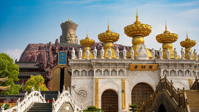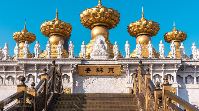 上海东林寺是上海金山区的有名寺庙,位于上海西南的朱泾镇,原名观音堂,于元朝至大元年(1308年)创建。不同于那些朴素的古寺,上海东林寺呈现的反而是恢宏气势,在这里可以看到大世界基尼斯之一“较高的铜门”——千佛门、较高的室内千手观音圣像、国内享有的室外五百罗汉山,可以感受到不一样的佛教氛围。上海东林寺七百年来香火长盛,但却因遭遇战乱、火灾而屡废屡建,在后来的一次重建前,整座寺庙只剩下一座大殿,但香火依旧。近年来经全方面重新扩建,崭新的上海东林寺于2007年呈现在人们面前,当时更由中国佛教协会会长一诚法师等佛教界高僧大德举办了启明法会,为民祈福,至今延续着旺盛的香火。如今的上海东林寺建筑风格独特,寺庙主体建筑依着一座高大的仿假山建筑而建,形成山寺合一。整座寺院分圆通殿、大雄宝殿、观音阁、善财阁、佛头像、千佛门、钟楼、鼓楼、金愿桥、五佛冠、金莲池(景泰兰善财童子)等景点。进入上海东林寺需先过三门,三门结合净土宗的思想,是国内佛寺中仅有的、庄严的三门;而后可看到金莲池,池正中为国内的景泰蓝佛像尊“善财童子”,堪称“东林一绝”;寺内还有千姿百态的五百罗汉和中国佛教“千佛门”,都是上海东林寺的特色。上海东林寺寺内供奉的灵雨观音与杭州灵隐寺、无锡灵山大佛并称中国佛教“三灵”。圆通宝殿中是用黄铜制作而成的“殿中殿”,殿中供奉的是一尊整块用1.8吨重的新疆和田美玉雕琢而成的元代“灵雨观音”圣像,造像庄严,堪称镇寺之宝。