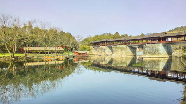 彩虹桥位于清华镇境内,始建于宋代,是古徽州的古老廊桥,也是婺源的标志之一,被媒体誉为“中国十分美丽廊桥”。岸边远观彩虹桥和水中的倒影,在周围山水映衬下显得更加生动,著名电影《闪闪的红星》也曾在此取景。桥中有石桌石凳,游人可坐在桥上稍作休憩,纵览四周风光。不过更多人会选择在岸上远观廊桥全貌,配合着旁边的村子、桥下的小溪,以及水中的竹排,拍廊桥和水中的倒影,随手一张都是大片。桥上的阁亭上面有一匾额,写着“长虹卧波”四个大字,下面的神龛内供奉着建此桥、重修此桥的先人,和上古治水的大禹。旁边的导览可让你了解关于彩虹桥的历史和建筑的特别之处。彩虹桥旁边是一条水上汀步,游人可踩着石墩过河,在水中央看廊桥的全景,很有意思。旅游旺季的时候排队过河的人非常多,只能从有水车的一端单向通行。不过既然来了,时间充裕的话,不妨不免俗套地从石墩上走一次。此外,你还可以坐上水边的小竹排徜徉江中,感觉很棒。除了廊桥本身,彩虹桥附近还有一个寺院,不过有些难找,也不属于景区管辖,一些游客还在此遇到被要求捐香火的情况,因此不太推荐专门去找。