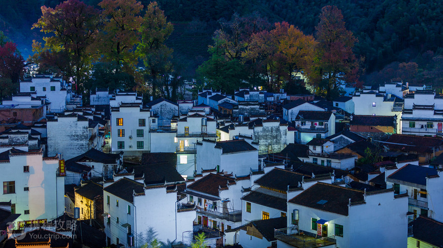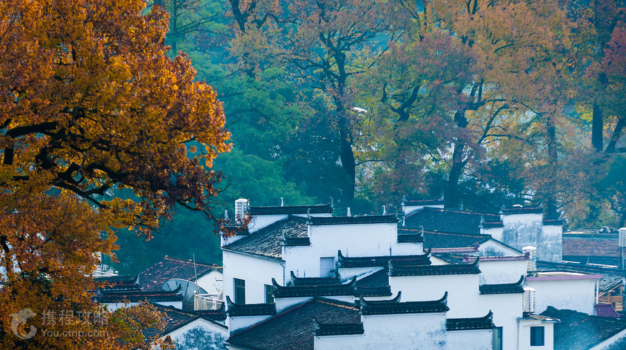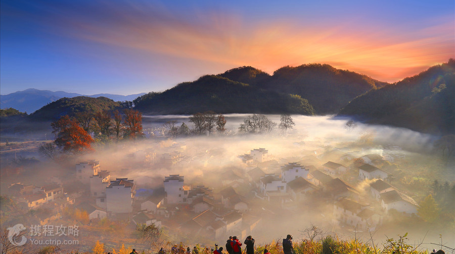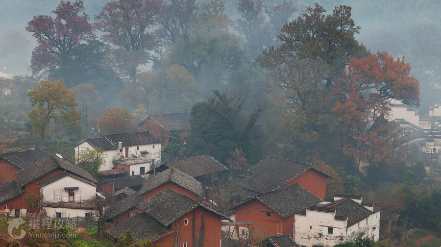 石城的精彩在深秋,枫叶火了,晨雾悬挂在树腰,红叶在晨雾中若隐若现,加上早晨村民的炊烟、烧油茶壳的烟,构成了如梦幻般的仙境。每年一到11月中下旬,这里就成为了无数摄影爱好者的天堂。石城是一座山的称呼,在婺源县西北的古坦乡(现合并入大鄣山乡)境内,婺源旅游地图上叫石城山,山脚下就是灵岩国家森林公园。山上分布有两个村庄,分别叫程村与戴村。戴村与程村隔着一个小山坡,村后有古枫点缀,两个村庄的秋色各具特色,拍完石城的日出晨曦后可以到村里转转。摄影贴士1. 一般选择在村庄后面的小山坡上摄影,逆光或者是侧逆光拍摄。拍摄戴村可以选择在两个村庄之间的山坡顶上俯拍,从程村过来的烟雾一阵阵地飘到戴村,拍起来也是如诗如画。2. 推荐拍摄时间是在11月初到12月初,11月中下旬很是适宜。从一天当中来看,早晨的6点半到8点半是推荐拍摄时间。早晨到达的时候,晨雾还没有起来,只有一点点。太阳一般在7点到7点15分之间升起来,太阳出来以后,晨雾与炊烟就动起来了,也许就隔一到二分钟,同一个地点,就会有不同的画面效果。3. 沿着小山坡向右走,一直绕着村庄后面,光线就会由逆光变成侧逆光,会有不同的效果。不过在旅游高峰期,可能很难找到一个好的位置,因为好位置上都站满了人,支起的三角架如同树林一般密集。