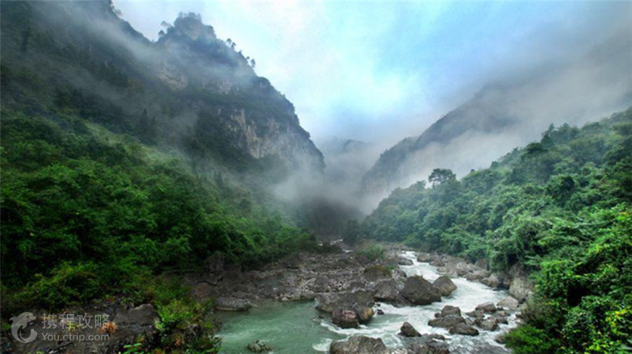 南江大峡谷地处贵阳东北部的开阳县,峡谷两岸是典型的喀斯特地貌,山崖夹着清澈的河流,姿态万千的瀑布群从山崖跌落,风光旖旎。游客既可以漫步于崖边的栈道欣赏峡谷风光,也可以体验刺激的峡谷漂流,乐趣十足。南江大峡谷大门口的停车场边上就是漂流起点,选择步行的游客可以在大门口坐一段电瓶车到景区里边。电瓶车的这一段路边上是河谷中的漂流,对于步行的游客来说没有什么景点可以看,而且只要买了门票,电瓶车坐进去和坐出来都是免费的。到了电瓶车终点站,景点才多起来,主要分为梯子岩景区和锣鼓冲景区两大部分。先过天门洞隧道到达梯子岩景区,一路上看看山崩角砺岩,形状像喇叭、深处窄外面宽的河谷喇叭口,再往前走没多远,就是梯子岩度假村了。在梯子岩餐厅可以吃点东西补充能量,休闲漂流的终点站上来也是这家餐厅。接着沿栈道向前走,一路可看奇特的植被,比如盘根错节的树根里抱着石头、石缝中长着的树,两岸的喀斯特山崖绿意盎然,空气十分清新。不时从山崖上挂下的瀑布也非常漂亮,比如天外天瀑布、在钙化石上形成的南江大峡谷-金钟瀑布、万珠瀑布等。还可欣赏奇石,有河流中央方方正正的大石头“南江大印”等。走到终点,是一处开阔的湖面,名鸳鸯湖,这边便是锣鼓冲景区了。南江大峡谷的漂流有两种,休闲漂流5公里,激情漂流8公里。激情漂流就是漂全程,而休闲漂流其实就是激情漂流的前半段。漂流从景区大门口开始,水流比较平缓,等经过景区的标志性瀑布之一水落亭台,再到操子塘后就是休闲漂终点了,上岸是梯子岩餐厅。如果是激情漂流,过了休闲漂终点仍然继续往前漂,漂到底,在鸳鸯湖那儿上岸。不论是步行游客还是漂流游客,到了鸳鸯湖有两种方式返回景区大门口。一种是鸳鸯湖先坐索道到山顶,若是爬到山顶的话要走900多级台阶,路比较险,到了山顶再坐免费的景区中巴返回大门口。如果错过了索道时间或者不想坐,也可以沿着栈道原路步行返回。南江大峡谷的特色美食除了拥有黔菜“辣醇、酸鲜、香浓、味厚”的特点,还含有丰富的矿物质硒,营养好,可以尝尝富硒腊肉。还有山中野兽,鱼鳞呈现出五彩斑斓的南江小花鱼、野生菌等。景区内的梯子岩餐厅都有供应这些菜。一天游完南江大峡谷时间绰绰有余,不太必要在景区内住宿。如果你是想要等候傍晚、清晨优美光线的摄影爱好者,或者想细细品味峡谷风光,景区中段的梯子岩度假村、边上的布依山寨、景区终点锣鼓冲的锣鼓冲度假村都有住宿。若住在梯子岩这边,晚上还有免费的篝火晚会可以参与。