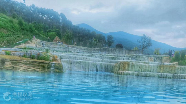 十万大山布透温泉位于上思县城北郊,距县城中心不足5公里,交通便利。景区开发建设温泉展示区、温泉中心区,宾馆酒店、水上休闲娱乐、购物中心、停车场、会议中心等设施,是一个集温泉度假、商务会议、养生保健、休闲娱乐为一体的度假山庄。 十万大山布透温泉三面环山,山丘岩石里含有白石灰垩,山上还有泉水不断的涌出,两者相互作用,形成白色梯田温泉,水温平均42℃。这里每一阶大大小小的池子里深浅各不相同,有的浅池子只有脚踝那么浅,深得更有半个腰那么深,站在高处看去就像是重重叠叠的棉花糖堆在了一起,景色奇美。在这里你可以一边泡温泉,一边赏山峦美景,呼吸新鲜空气,实乃冬季旅游度假胜地。