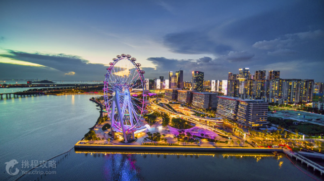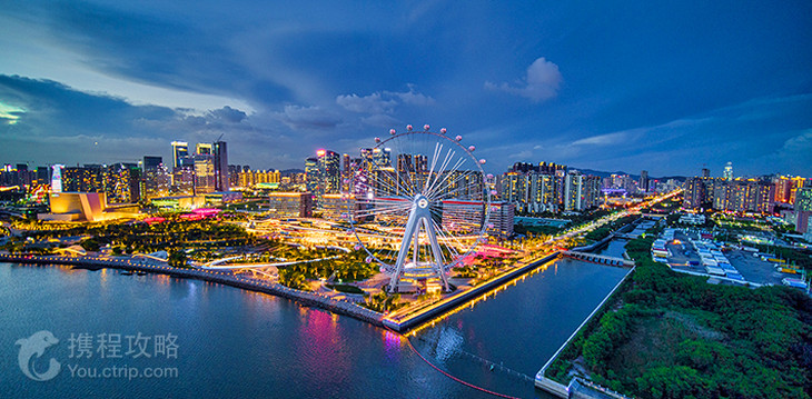 湾区之光摩天轮位于深圳欢乐港湾东端,由华侨城集团倾心打造,联合“伦敦眼”打造团队,欧洲STARNETHENGINEERING团队和巨马集团,融合全球先进的设计建造技术。湾区之光摩天轮总高128米,28个进口轿厢,每个面积约16.8平方米,可容纳25人。采用鱼鳍状异形大立架,造型来自海洋的奇想,不仅有着的开阔视野,更是结构走向艺术的突破。上下客分流系统,合理配置人流动线,椭球回转式太空舱为国内首创。全天景回转式轿厢,超稳定系统,让乘客扶摇直上如履平地。随着摩天轮缓慢旋转,人们不仅可以将轿厢外迷人的风景尽收眼底,还能拥有更多特别的“高空体验”。为体验打造的专属轿厢,为浪漫而生的婚礼轿厢,为舌尖之旅准备的美食轿厢,为儿童打造专属生日Party,为聚会定制的闺蜜下午茶,为游客带来了不一样的高空之旅。作为深圳上空高的摩天轮,也是国内全天景回转式进口轿厢摩摩天轮,华灯初上,湾区之光摩天轮点亮城市夜空,与海景、公园构成一副浪漫画面,成为粤港澳大湾区的梦幻地标。