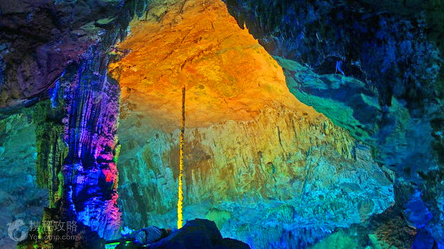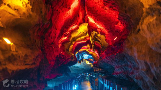 丰鱼岩是荔浦的老牌岩洞景点之一,距离县城15公里。它贯穿九座大山,是罕见的大溶洞。这些年来,同在荔浦的银子岩后来居上,抢去了丰鱼岩不少风头。 整个景区可大致分为三部分,一进洞后步行、地下暗河的乘船游览部分、出地面的山边小火车,门票中含有导游费、游船和“空中列车”的小火车费用。整个洞内游程大约2-3小时,走起来不算太累,洞内也有洗手间等配套设施。 步行游览的旱洞全长大约2公里,其中一个洞的面积有两个足球场大,洞中的石笋、石柱等彩灯的照射下呈现处奇妙的形态。一处近10米高的定海神针是镇山之宝。后面的暗河漂流大约1.3公里,坐在船上欣赏溶洞景色,又是另一番感受。出溶洞后可前去坐小火车,火车行驶在山间,又可以领略丰鱼岩的陆上风光。不过,若是想要坐小火车无比注意游览时间,若是下午出洞太晚,山间的光线就比较暗了。 岩洞门口有不少卖披肩、帽子的店家,说是洞里很冷可以买一张来御寒。洞内确实较外面温度低很多,但是否需要披肩就见仁见智了。景区内还建有丰鱼岩宾馆、山城度假酒店等,标间一两百元上下,也可在此留宿。