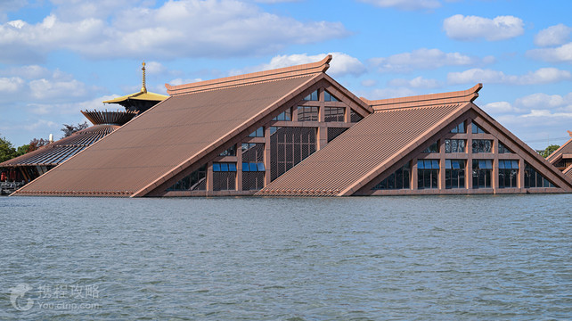 广富林文化展示馆,位于漂浮在富林湖中的第一个大屋顶和边侧的圆形建筑内,整个展览空间均设置在水下。进入展馆,给人以踏入地下和走向远古的暗示。展厅设计以“时空之旅”为理念,通过广富林考古记忆、上海成陆演变、先民活动到来、城邑特征形成、松江县府兴盛、上海城市崛起、走向未来明天等场景设计,让观众在时光隧道中体验和阅读上海这座城市,从哪里来,到哪里去。