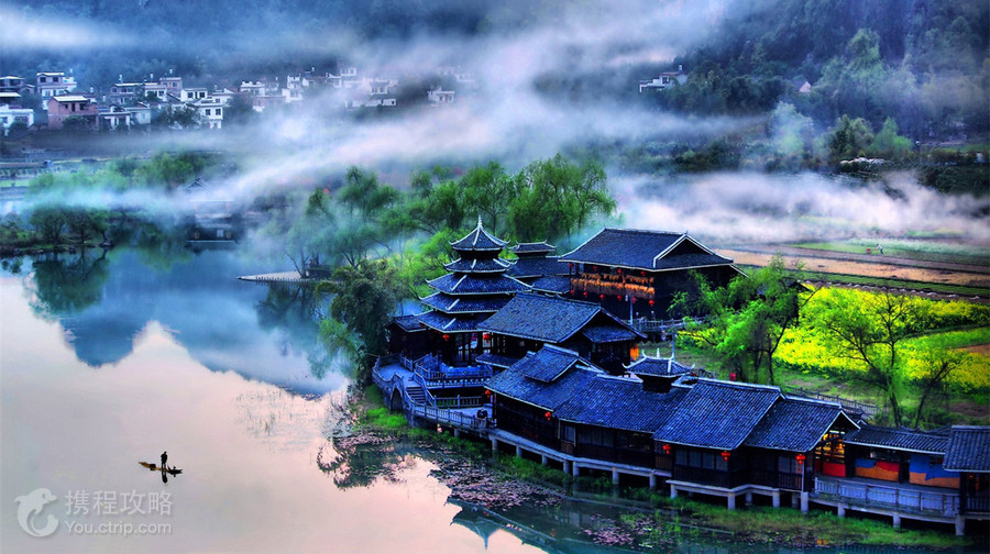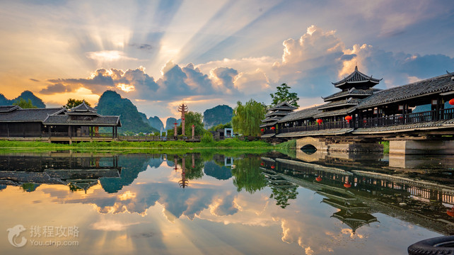 世外桃源位于阳朔县城西北约15公里处,这里是根据陶渊明所著《桃花源记》中描绘的意境,结合当地的田园山水风光所建的民俗风景园区。虽说是一处人造景区,但这里的秀美风景以及营造的民俗风情都非常吸引人。 通常游程的前半段是船游燕子湖(船票包含在景区门票内),登岸后步行游览,全程1-2小时。进入景区后,从1号码头登船,沿路可欣赏如同陶渊明笔下《桃花源记》中的那般景象。在对面世外桃源-水乡侗寨附近的2号码头上岸,可步行游览此处的民族建筑,如花楼、鼓楼、世外桃源-绣球楼、世外桃源-图腾柱等,也有一条充满民族风情的长廊,出售一些旅游纪念品。 游人多时,景区内便会上演苗族、瑶族、侗族、壮族等风情各异的歌舞,也有游人可参与的抛绣球送祝福、古代造纸、雕刻等体验活动,通常没有隐性收费。
